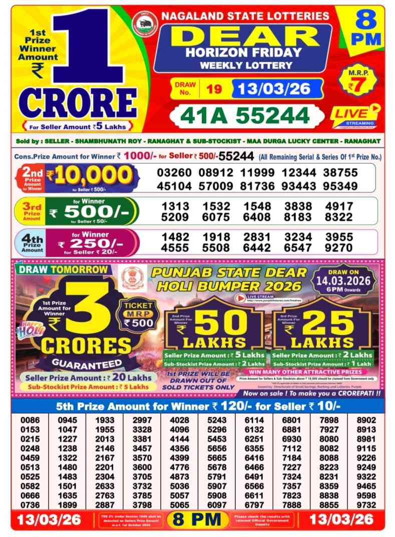 Nagaland State Lottery 14.3.2026 Today Result is weekly lottery draw whose lottery result is published thrice a day. Mainly Nagaland State Lottery is 8pm Nagaland State Lottery but being combined with lottery sambad, Nagaland State Lottery will release the results of 1pm, 6pm, 8pm. is published.