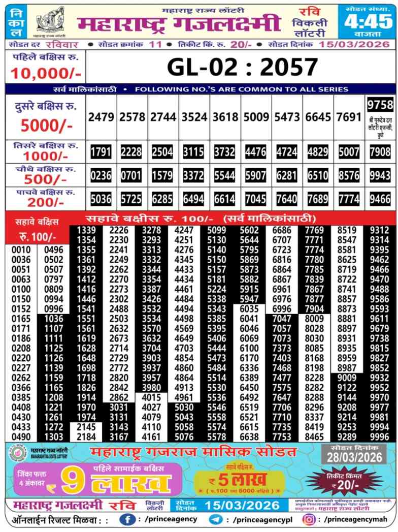Maharashtra State Lottery 15.3.2026 Today Result is Maharashtra State Gajlaxmi Ravi Weekly Weekly lottery Result draw whose Maharashtra lottery result is published a day. Mainly Maharashtra State Lottery is 4:45 pm Maharashtra State Lottery but being combined with lottery sambad, Maharashtra State Lottery will release the results of 04:45pm is published.