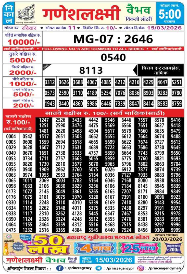 Maharashtra State Ganeshlaxmi Vaibhav Weekly Lottery ticket is only Maharashtra Weekly rupees 10 for 1 ticket, but 10 thousand is given as prize for winning the major. Results are also placed on this page which you can see Ganeshlaxmi Vaibhav Weekly Lottery Result today 15.3.2026 is searched by different names, Maharashtra State Ganeshlaxmi Vaibhav Weekly Lottery Result 05:00pm, Maharashtra State lottery 05:00pm result , Maharashtra State Lottery today Ganeshlaxmi Vaibhav Weekly lottery result, Maharashtra Ganeshlaxmi Vaibhav Lottery Result, Maharashtra State Ganeshlaxmi Vaibhav Weekly lottery result 2026, Ganeshlaxmi Vaibhav Weekly lottery result 05:00pm, Maharashtra State lottery 2026.
