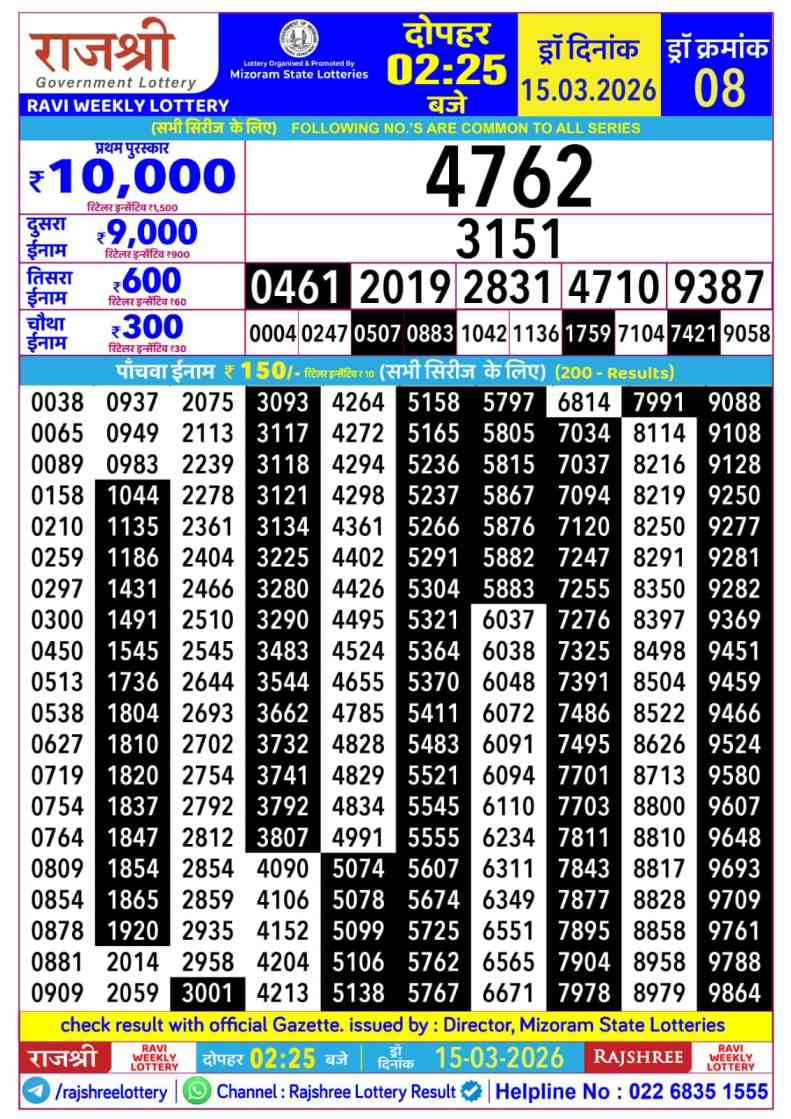 Mizoram Rajshree Lottery declares many bumper results. Today Rajshree Lottery Result 2026 is Mizoram Rajshree Lottery at 01:00 PM whose result gets published on the page around 01:30 PM. Mizoram Rajshree Lottery Result ,15.3.2026 Ravi Result, Rajshree Result Today Live 01:00PM, Mizoram Rajshree Ravi Weekly Result, Mizoram Rajshree Lottery Result 01:00PM, Mizoram Ravi Result 1:00 PM, Mizoram Lottery Result Today 01:00PM, Rajshree Weekly Lottery Result 15.3.2026.