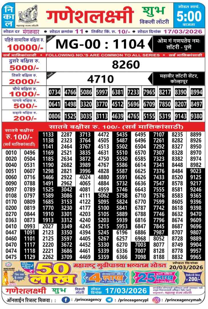 | Maharashtra Ganeshlaxmi Vijayi Weekly Lottery Result Today Live 17.3.2026 | |