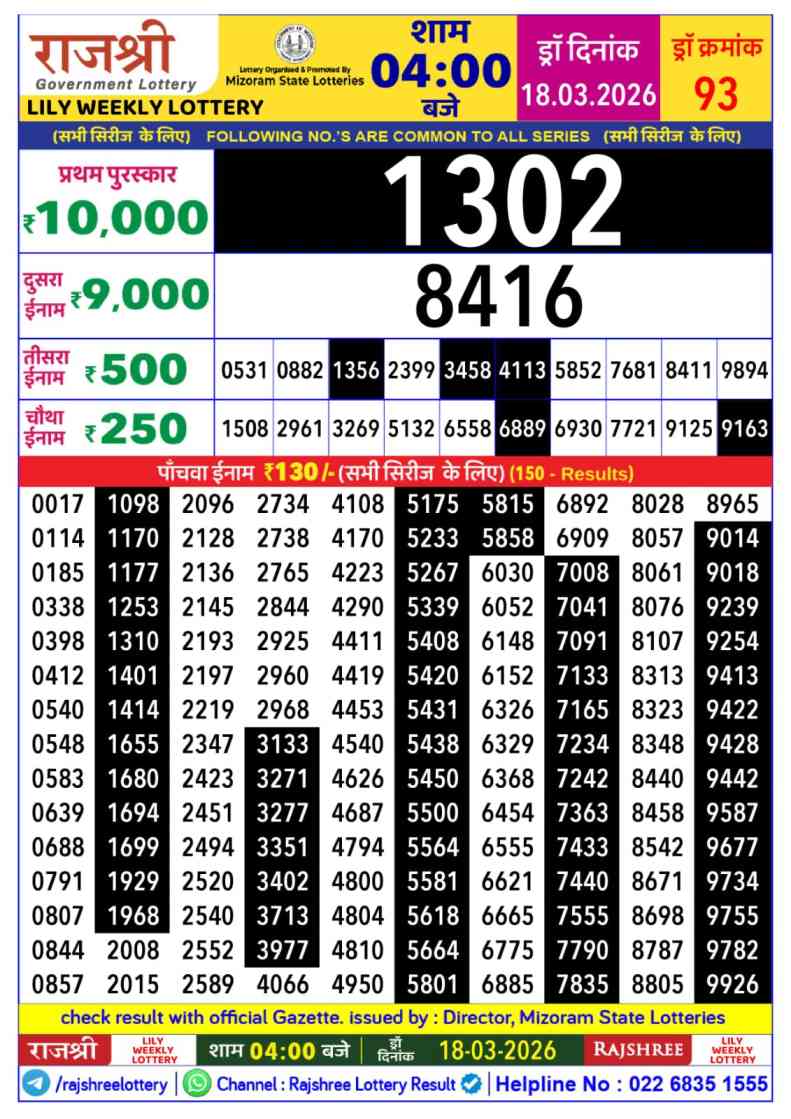 Mizoram Rajshree Lottery declares many bumper results. Today Rajshree Lily Lottery Result 2026 is Mizoram Rajshree Lottery at 03:30 PM whose result gets published on the page around 04:12 PM. Mizoram Rajshree Lottery Result ,18.3.2026 Lily Budh Result, Rajshree Lily Result Today Live 4:00PM, Mizoram Rajshree Lily Budh Weekly Result, Mizoram Rajshree Lottery Result 4:00PM, Mizoram Lily Budh Result 3:30 PM, Mizoram Lottery Result Today 4:00PM, Rajshree Lily Weekly Lottery 3:30 PM Result 18.3.2026.