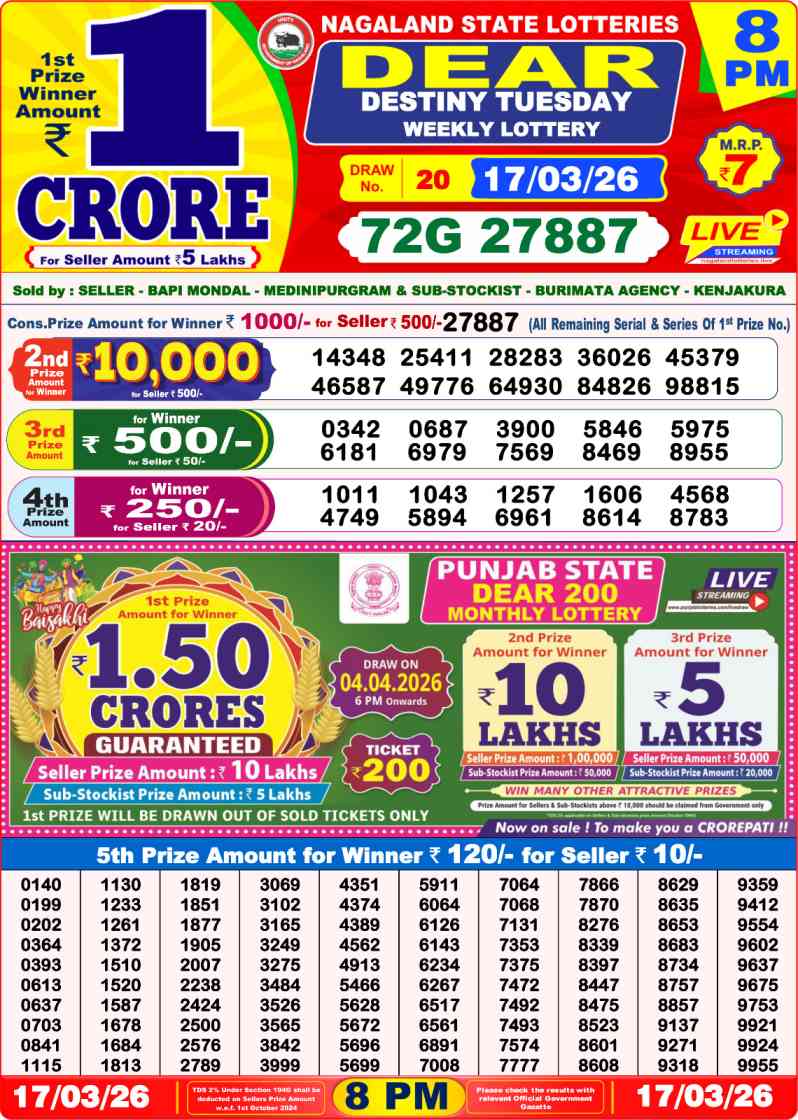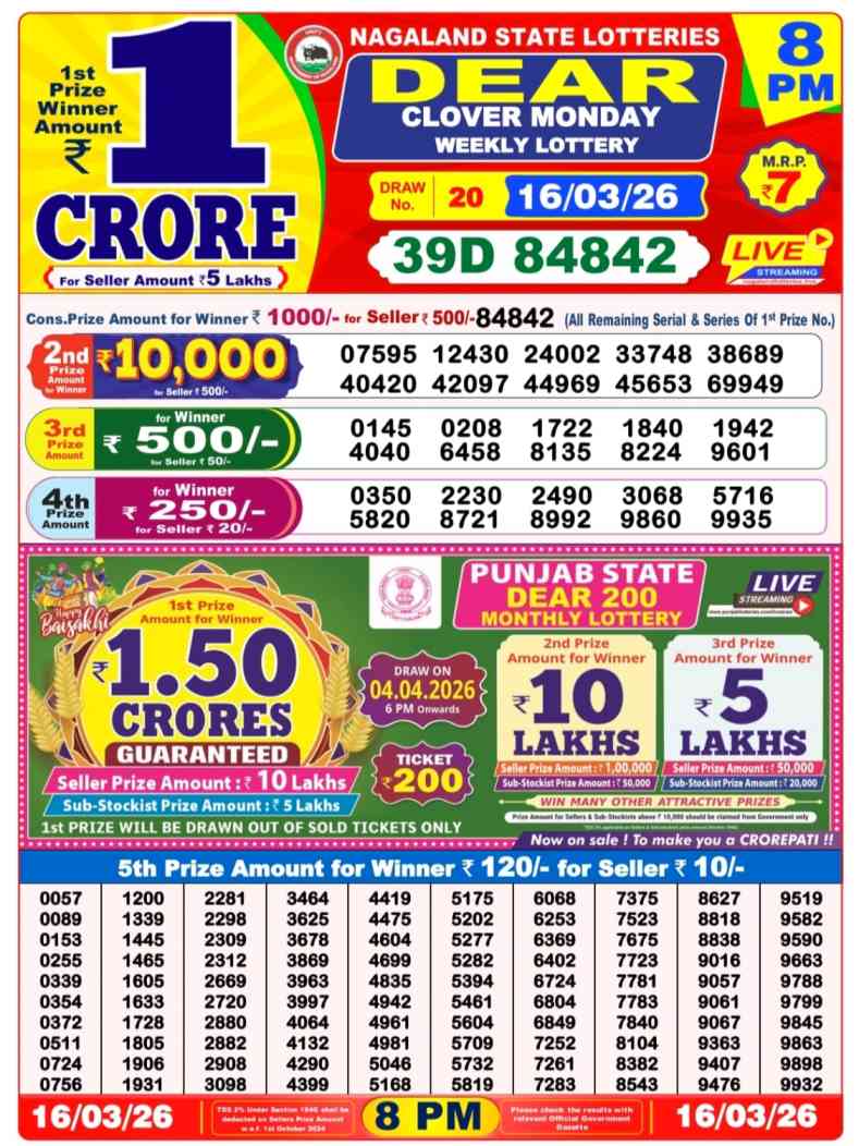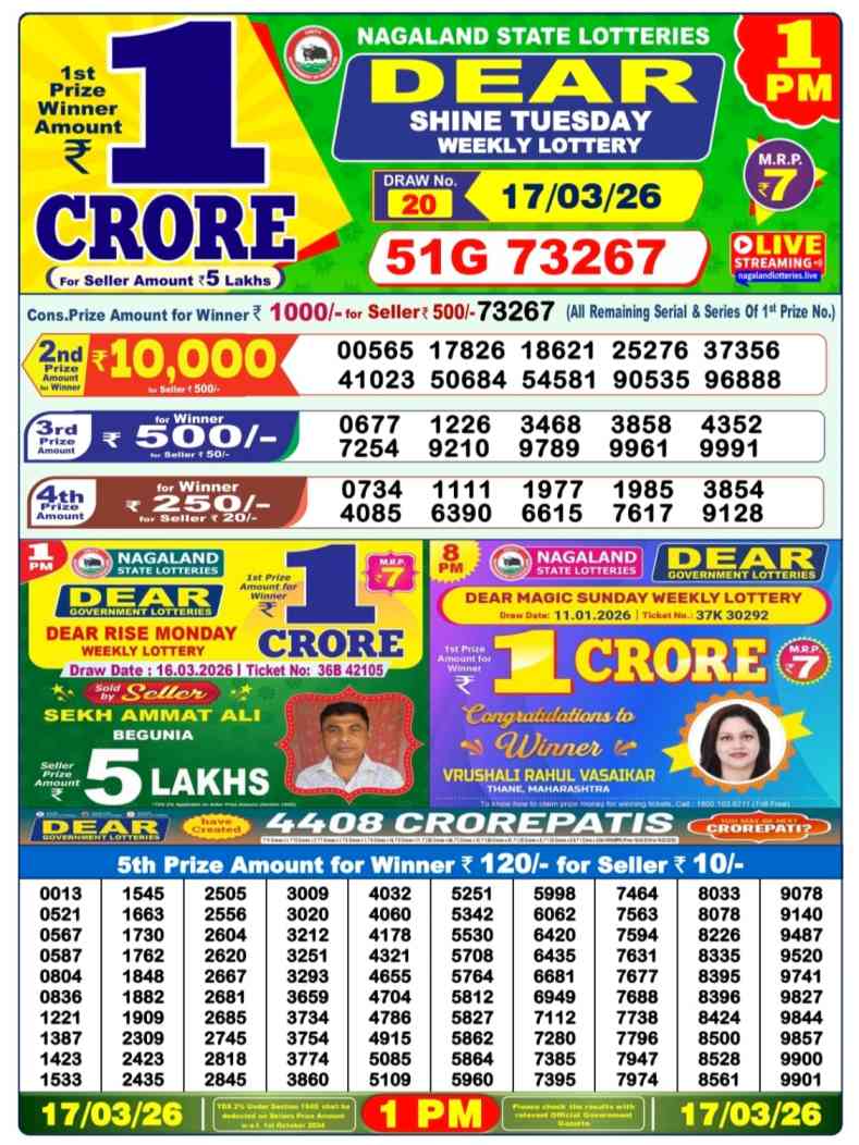 Nagaland State Lottery 18.3.2026 Today Result is weekly lottery draw whose lottery result is published thrice a day. Mainly Nagaland State Lottery is 8pm Nagaland State Lottery but being combined with lottery sambad, Nagaland State Lottery will release the results of 1pm, 6pm, 8pm. is published.