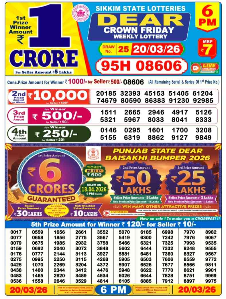 The Sikkim State Lottery Sambad Result is published by Sikkim State at 1pm, 6pm, 8pm. Which regularly publishes the lottery results weekly and thrice a day.