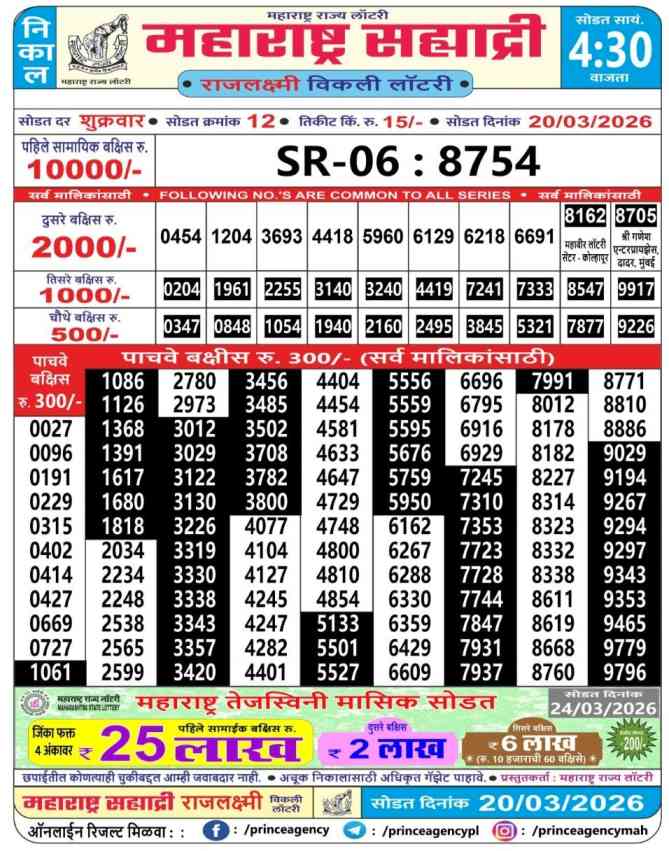Maharashtra State Lottery declares many bumper results. Sahyadri Rajlaxmi Weekly Lottery Result 2026 is Maharashtra State Lottery at 04:30 PM whose result gets published on the page around 05:30 PM. Maharashtra State Lottery Result ,20.3.2026 Sahyadri Rajlaxmi Weekly Result, Sahyadri Rajlaxmi Result Today Live 4:30PM, Maharashtra Sahyadri Rajlaxmi Weekly Result 4:30PM, Maharashtra State Sahyadri Rajlaxmi Weekly Result, Maharashtra State lottery result 4:30PM, Sahyadri Rajlaxmi Weekly Result, Sahyadri Rajlaxmi Weekly result, Maharashtra Rajlaxmi Lottery Result Today 4:30PM, Sahyadri Rajlaxmi Lottery 4:30 pm result 20.3.2026, Maharashtra Sahyadri Rajlaxmi Weekly Lottery Result, Sahyadri Rajlaxmi Live Draw.