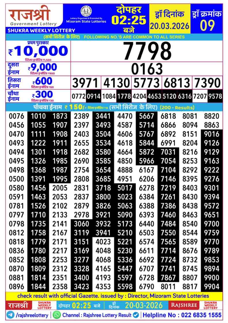 Download Mizoram Rajshree Lottery Shukra 20.3.2026 Today 01:00PM Result from here. Mizoram Rajshree Weekly Lottery Result Important Lottery of Mizoram Rajshree which is legally operated by the Rajshree Government there. You are satisfied to Get The Result of Shukra weekly Lottery at 01:00PM on this webpost Today’s Lottery Result of Mizoram Rajshree Lottery 01:00PM is published here.