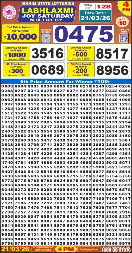 Sikkim State Labh laxmi Joy Saturday Lottery ticket is only Labh laxmi Joy rupees for 1 ticket, but 10,000 is given as prize for winning the major. Results are also placed on this page which you can see Labh laxmi Joy Saturday Lottery Result today 21.3.2026 is searched by different names, Sikkim State Labh laxmi Joy Lottery Result 4PM, Sikkim State lottery 4PM result , Sikkim State Lottery today Labh laxmi Joy lottery result, Sikkim Labh laxmi Saturday Lottery Result, Sikkim State Labh laxmi Joy Saturday lottery result 2026, Labh laxmi Joy lottery result 4PM, Sikkim State lottery 2026.