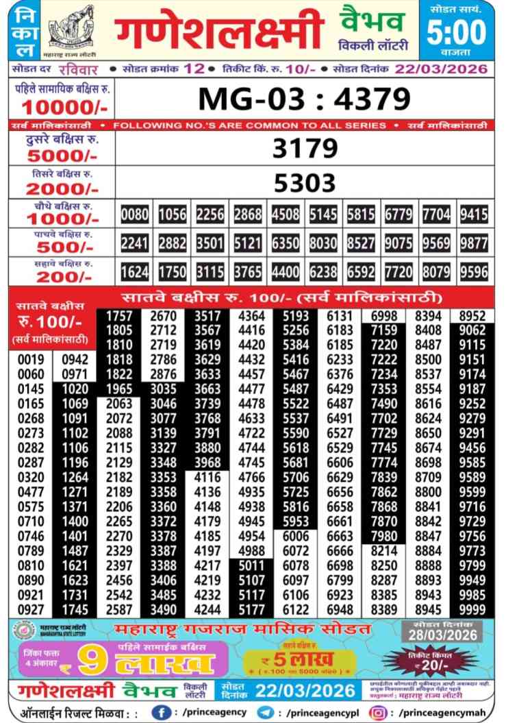 Maharashtra State Ganeshlaxmi Vaibhav Weekly Lottery ticket is only Maharashtra Weekly rupees 10 for 1 ticket, but 10 thousand is given as prize for winning the major. Results are also placed on this page which you can see Ganeshlaxmi Vaibhav Weekly Lottery Result today 22.3.2026 is searched by different names, Maharashtra State Ganeshlaxmi Vaibhav Weekly Lottery Result 05:00pm, Maharashtra State lottery 05:00pm result , Maharashtra State Lottery today Ganeshlaxmi Vaibhav Weekly lottery result, Maharashtra Ganeshlaxmi Vaibhav Lottery Result, Maharashtra State Ganeshlaxmi Vaibhav Weekly lottery result 2026, Ganeshlaxmi Vaibhav Weekly lottery result 05:00pm, Maharashtra State lottery 2026.