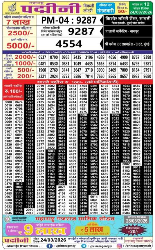 Maharashtra State Lottery declares many bumper results. Maharashtra Padmini 2026 Result is Maharashtra State Lottery at 04:15 PM whose result gets published on the page around 05:00 PM. Maharashtra State Padmini Weekly Lottery Result 24.3.2026 Live Draw Winner List at 4.15 PM, Maharashtra Dear Padmini Lottery 2026, Today Maharashtra Padmini Lottery, Maharashtra State Lottery Padmini Lottery Result Today Live, Maharashtra Padmini Draw 2026, Maharashtra Lottery Padmini Result 2026, Maharashtra Lottery 2026, Maharashtra State Lottery Result 2026, Maharashtra Padmini Lottery 24.3.2026 Result.