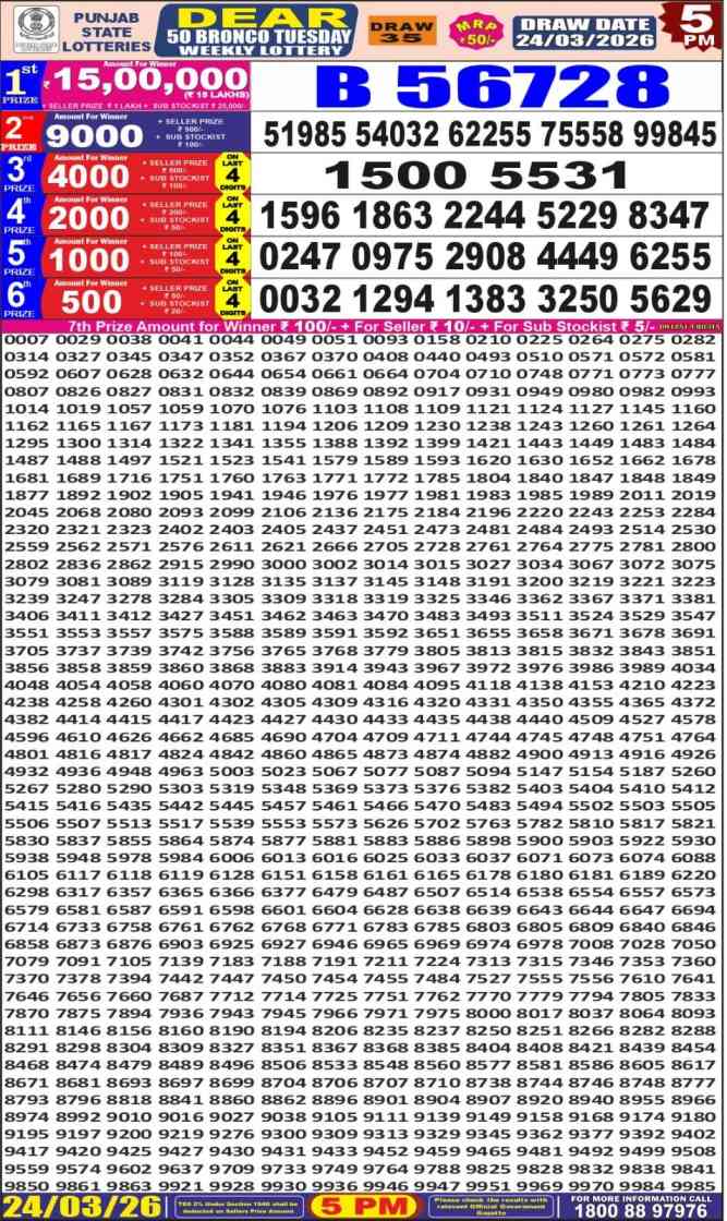 Punjab State Lottery 24.3.2026 Today Result is Punjab State Dear 50 Bronco Tuesday Weekly lottery Result draw whose Punjab lottery result is published a day. Mainly Punjab State Lottery is 6:00 pm Punjab State Lottery but being combined with lottery sambad, Punjab State Lottery will release the results of 06:00pm is published.