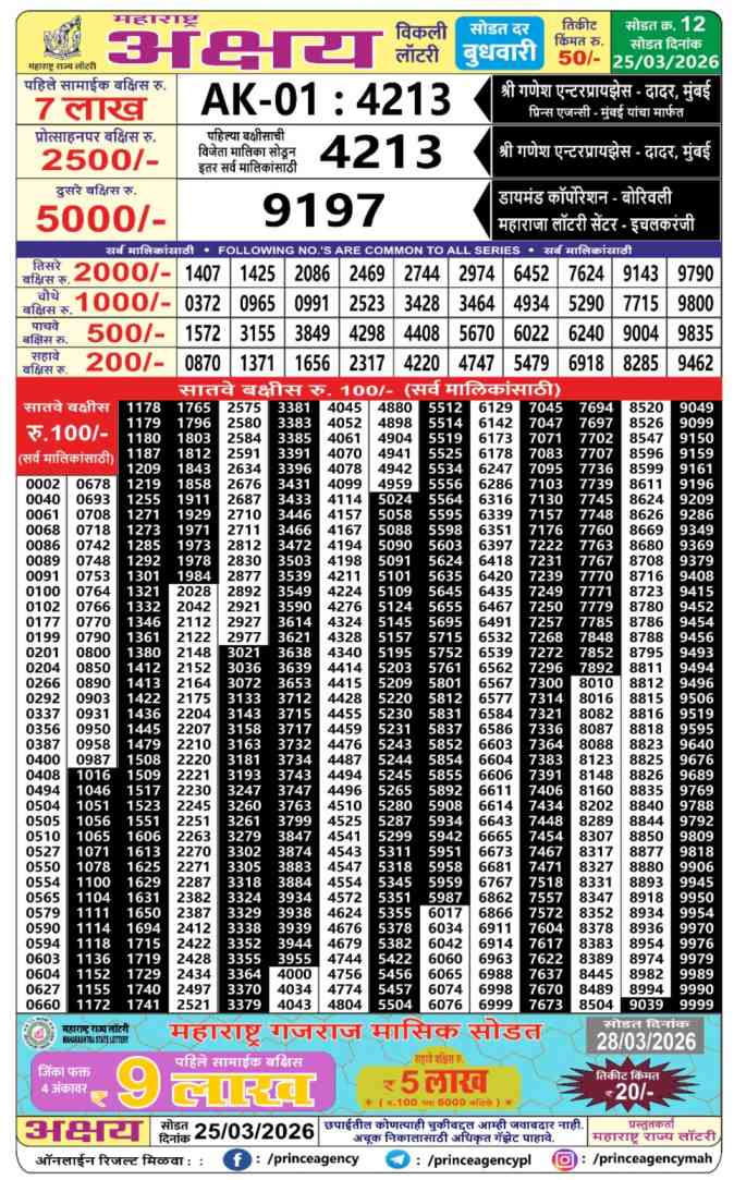 Maharashtra State Akshay lottery ticket is only 50 rupees for 1 ticket, but 8,00,000 Rupees is given as prize for winning the major. Results are also placed on this page which you can see Maharashtra Akshayr Result Today 25.3.2026 is searched by different names, Maharashtra State Akshay Weekly 2026, Maharashtra Akshay Weekly Lottery Result 2026, Maharashtra Akshay Lottery Result 25.3.2026 Live Result 4:15 PM, Maharashtra Akshay Lottery Result 25.3.2026, Dear Maharashtra Akshay PDF Result, Today Live Maharashtra Akshay Weekly Lottery Result, Maharashtra State Akshay Weekly 2026 Draw, Maharashtra State Akshay Weekly 2026 Result.