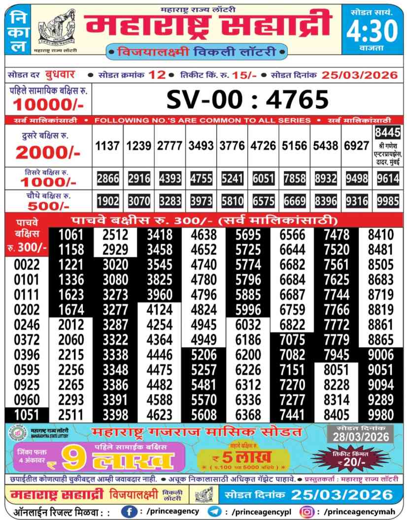 Maharashtra State Lottery 25.3.2026 Today Result is Maharashtra State Sahyadri Mahalaxmi Weekly Weekly lottery Result draw whose Maharashtra lottery result is published a day. Mainly Maharashtra State Lottery is 4:30 pm Maharashtra State Lottery but being combined with lottery sambad, Maharashtra State Lottery will release the results of 04:30PM is published.