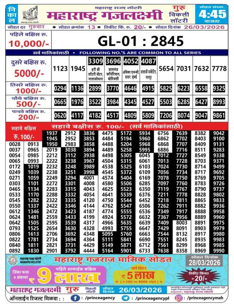 Maharashtra State Lottery 26.3.2026 Today Result is Maharashtra State Gajlaxmi Guru Weekly Weekly lottery Result draw whose Maharashtra lottery result is published a day. Mainly Maharashtra State Lottery is 4:45 pm Maharashtra State Lottery but being combined with lottery sambad, Maharashtra State Lottery will release the results of 04:45pm is published.