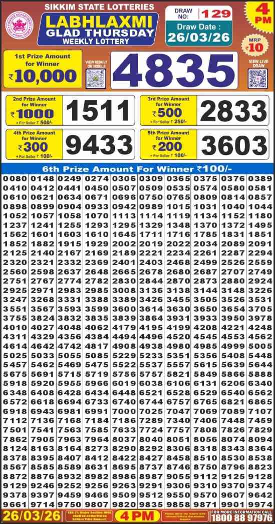 Sikkim State Labh laxmi Glad Thursday Lottery ticket is only Ten rupees for 1 ticket, but 10,000 is given as prize for winning the major. Results are also placed on this page which you can see Labh laxmi Glad Thursday Lottery Result today is searched by different names, Sikkim State Labh laxmi Glad Lottery Result 4pm, Sikkim State lottery 4PM result , Sikkim State Lottery today Labh laxmi Glad lottery result, Sikkim Labh laxmi Thursday Lottery Result, Sikkim State Labh laxmi Glad Thursday lottery result 26.3.2026, Labh laxmi Glad lottery result 4pm, Sikkim State lottery 26.3.2026.