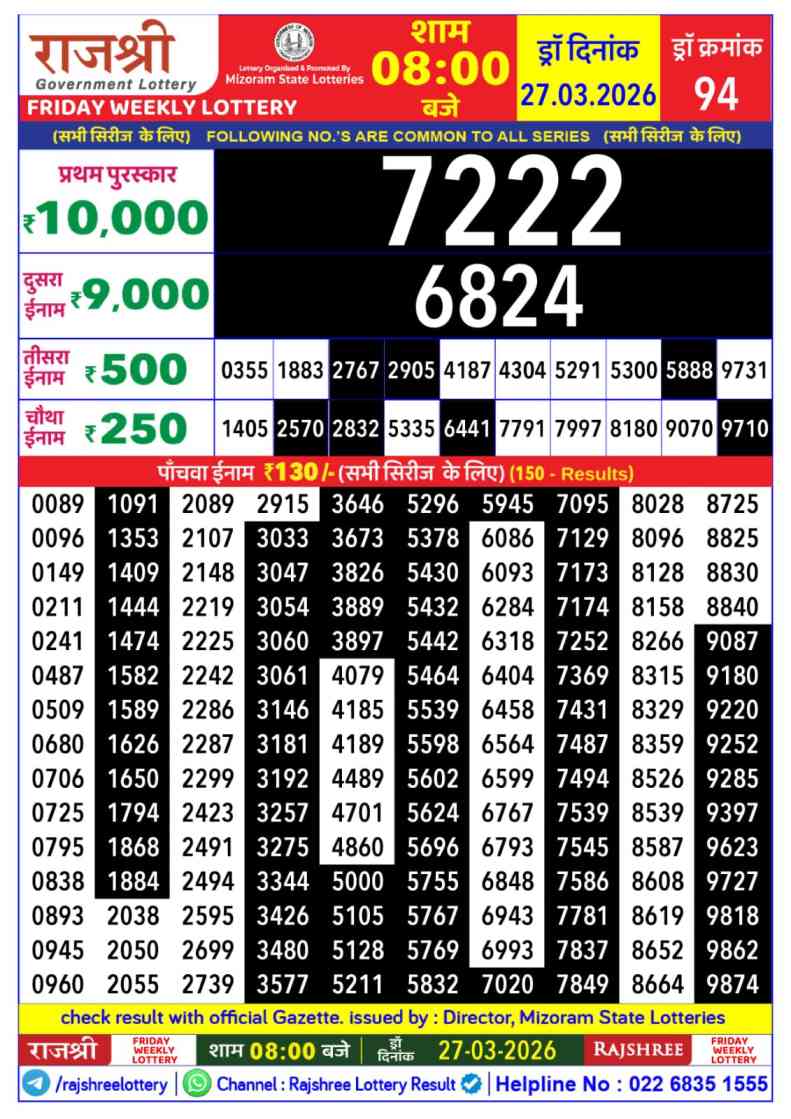 | Mizoram Rajshree Friday Weekly Lottery Result Today Live 27.3.2026 | |