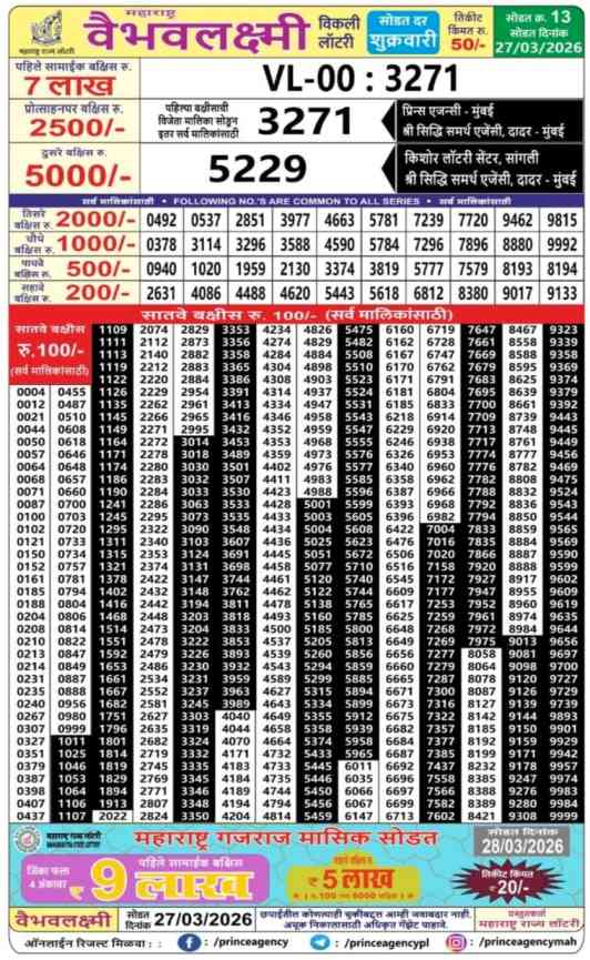 Maharashtra State Vaibhav Laxmi lottery ticket is only 50 rupees for 1 ticket, but 7 Lakh Rupees is given as prize for winning the major. Results are also placed on this page which you can see Maharashtra Vaibhav Laxmir Result Today 27.3.2026 is searched by different names, Maharashtra State Vaibhav Laxmi Weekly 2025, Maharashtra Vaibhav Laxmi Weekly Lottery Result 2025, Maharashtra Vaibhav Laxmi Lottery Result 27.3.2026 Live Result 4:15 PM, Maharashtra Vaibhav Laxmi Lottery Result 27.3.2026, Dear Maharashtra Vaibhav Laxmi PDF Result, Today Live Maharashtra Vaibhav Laxmi Weekly Lottery Result, Maharashtra State Vaibhav Laxmi Weekly 2025 Draw, Maharashtra State Vaibhav Laxmi Weekly Lottery Result.