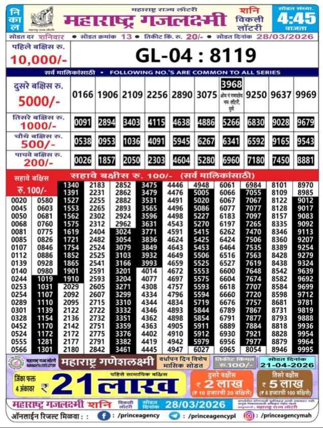 Maharashtra State Gajlaxmi Shani Weekly Lottery ticket is only Shani Weekly rupees for 1 ticket, but 1 Lakh is given as prize for winning the major. Results are also placed on this page which you can see Gajlaxmi Shani Weekly Lottery Result today 28.3.2026 is searched by different names, Maharashtra State Gajlaxmi Shani Weekly Lottery Result 4:45pm, Maharashtra State lottery 4:45pm result , Maharashtra State Lottery today Gajlaxmi Shani Weekly lottery result, Maharashtra Gajlaxmi Shani Lottery Result, Maharashtra State Gajlaxmi Shani Weekly lottery result 2026, Gajlaxmi Shani Weekly lottery result 4:45pm, Maharashtra State lottery 2026.