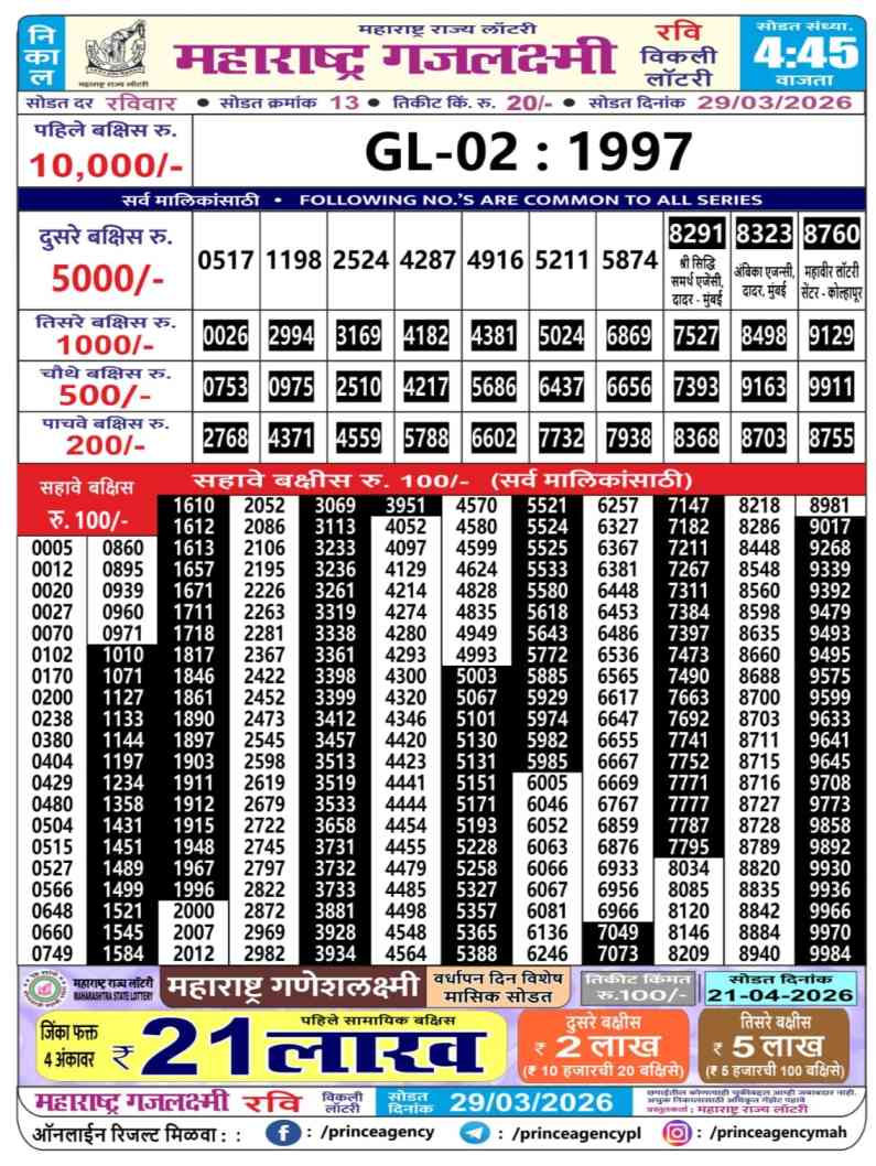 Maharashtra State Lottery 29.3.2026 Today Result is Maharashtra State Gajlaxmi Ravi Weekly Weekly lottery Result draw whose Maharashtra lottery result is published a day. Mainly Maharashtra State Lottery is 4:45 pm Maharashtra State Lottery but being combined with lottery sambad, Maharashtra State Lottery will release the results of 04:45pm is published.