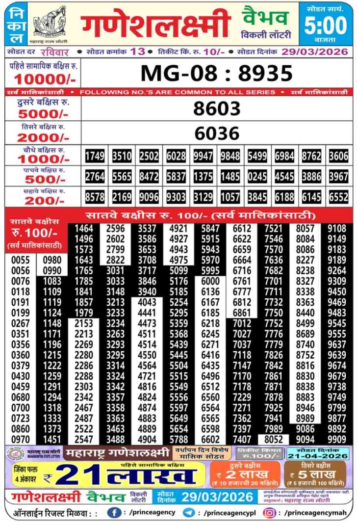 Maharashtra State Ganeshlaxmi Vaibhav Weekly Lottery ticket is only Maharashtra Weekly rupees 10 for 1 ticket, but 10 thousand is given as prize for winning the major. Results are also placed on this page which you can see Ganeshlaxmi Vaibhav Weekly Lottery Result today 29.3.2026 is searched by different names, Maharashtra State Ganeshlaxmi Vaibhav Weekly Lottery Result 05:00pm, Maharashtra State lottery 05:00pm result , Maharashtra State Lottery today Ganeshlaxmi Vaibhav Weekly lottery result, Maharashtra Ganeshlaxmi Vaibhav Lottery Result, Maharashtra State Ganeshlaxmi Vaibhav Weekly lottery result 2026, Ganeshlaxmi Vaibhav Weekly lottery result 05:00pm, Maharashtra State lottery 2026.