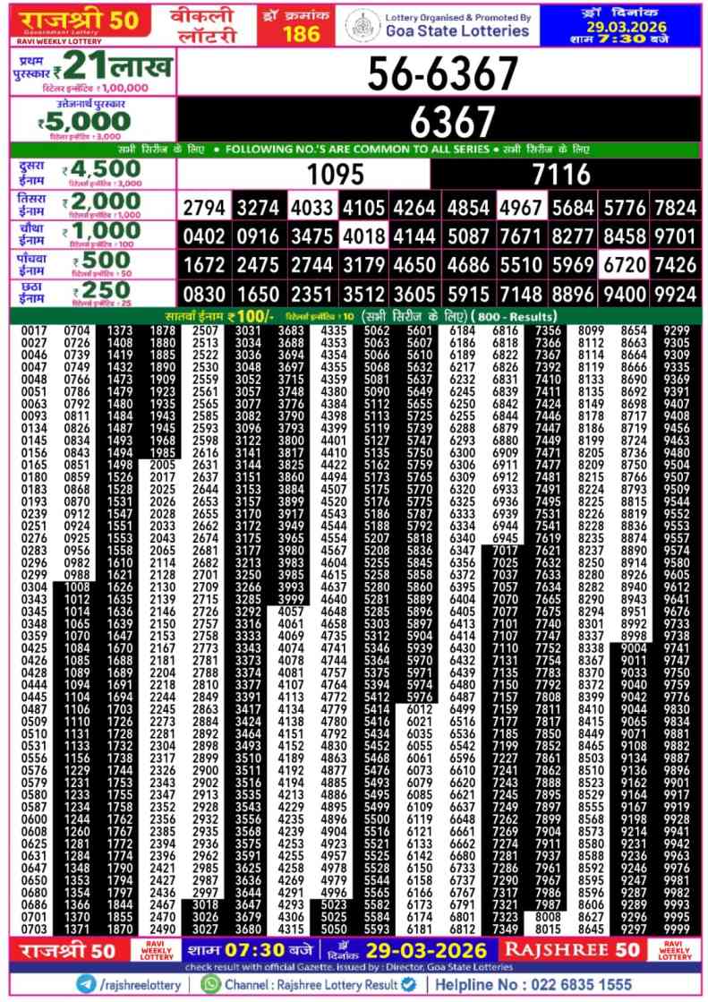 Download Goa Rajshree Lottery 50 Ravi 29.3.2026 Today 7:30pm Result from here. Goa Rajshree 50 Weekly Lottery Result Important Lottery of Goa Rajshree which is legally operated by the Rajshree Government there. You are satisfied to Get The Result of 50 Ravi weekly Lottery at 07:30pm on this webpost Today’s Lottery Result of Goa Rajshree Lottery 7:30pm is published here.