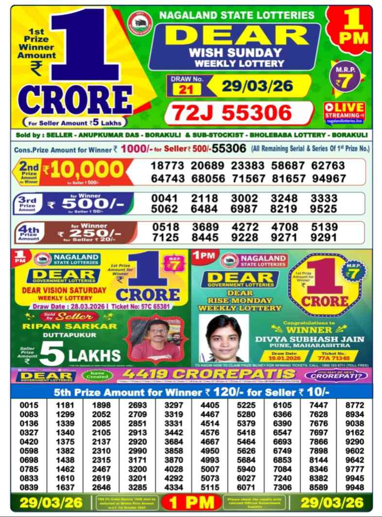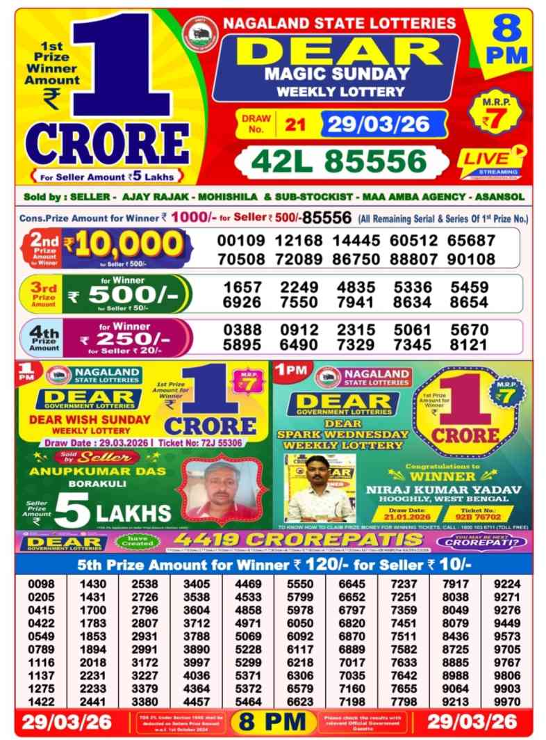 Nagaland State Lottery 30.3.2026 Today Result is weekly lottery draw whose lottery result is published thrice a day. Mainly Nagaland State Lottery is 8pm Nagaland State Lottery but being combined with lottery sambad, Nagaland State Lottery will release the results of 1pm, 6pm, 8pm. is published.