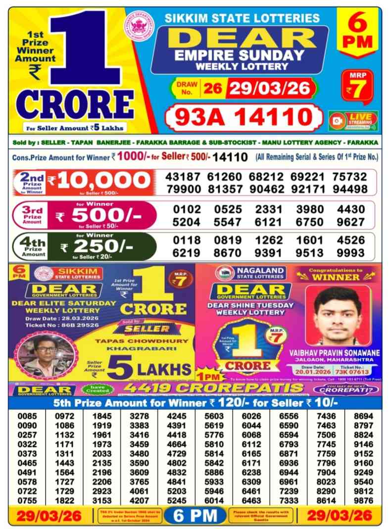 As per the official information provided by the Nagaland State Lotteries, 30.3.2026 Results the winner of today’s Dear First Winner award will receive INR 1 Crore from a ticket worth INR 6. You can check your result from the lotterysambad 30 3 26 link given below…