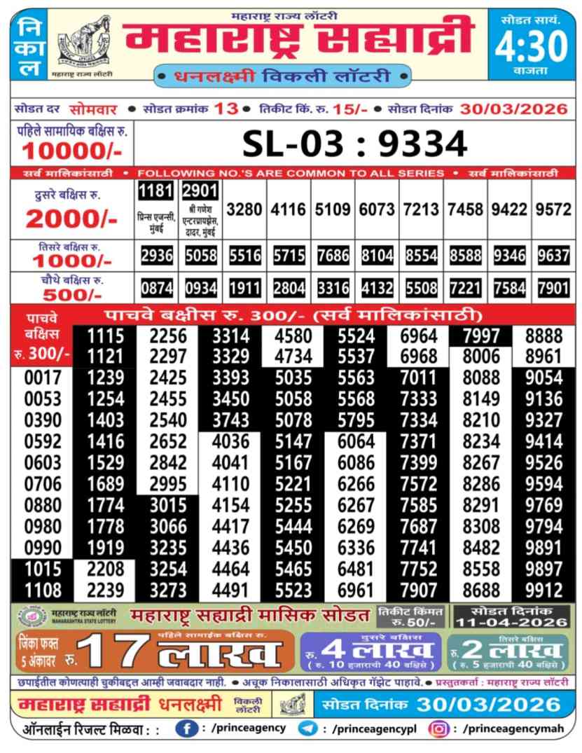 Maharashtra Sahyadri Dhanlaxmi Weekly Lottery Result 30.3.2026 Today Latest Update on 30 March 2026 : -Maharashtra State Lottery’s Sahyadri Dhanlaxmi Weekly Weekly Lottery Results have been declared today on 30.3.2026 Maharashtra Sahyadri Dhanlaxmi Weekly 4:30PM.