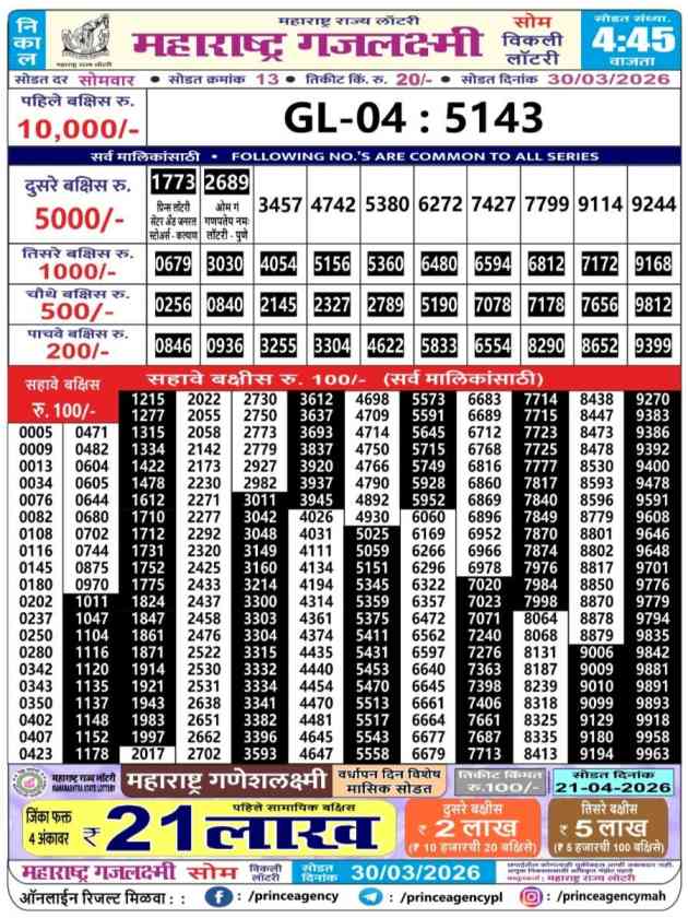 Maharashtra State Lottery 30.3.2026 Today Result is Maharashtra State Gajlaxmi Som Weekly Weekly lottery Result draw whose Maharashtra lottery result is published a day. Mainly Maharashtra State Lottery is 4:45 pm Maharashtra State Lottery but being combined with lottery sambad, Maharashtra State Lottery will release the results of 04:45pm is published.