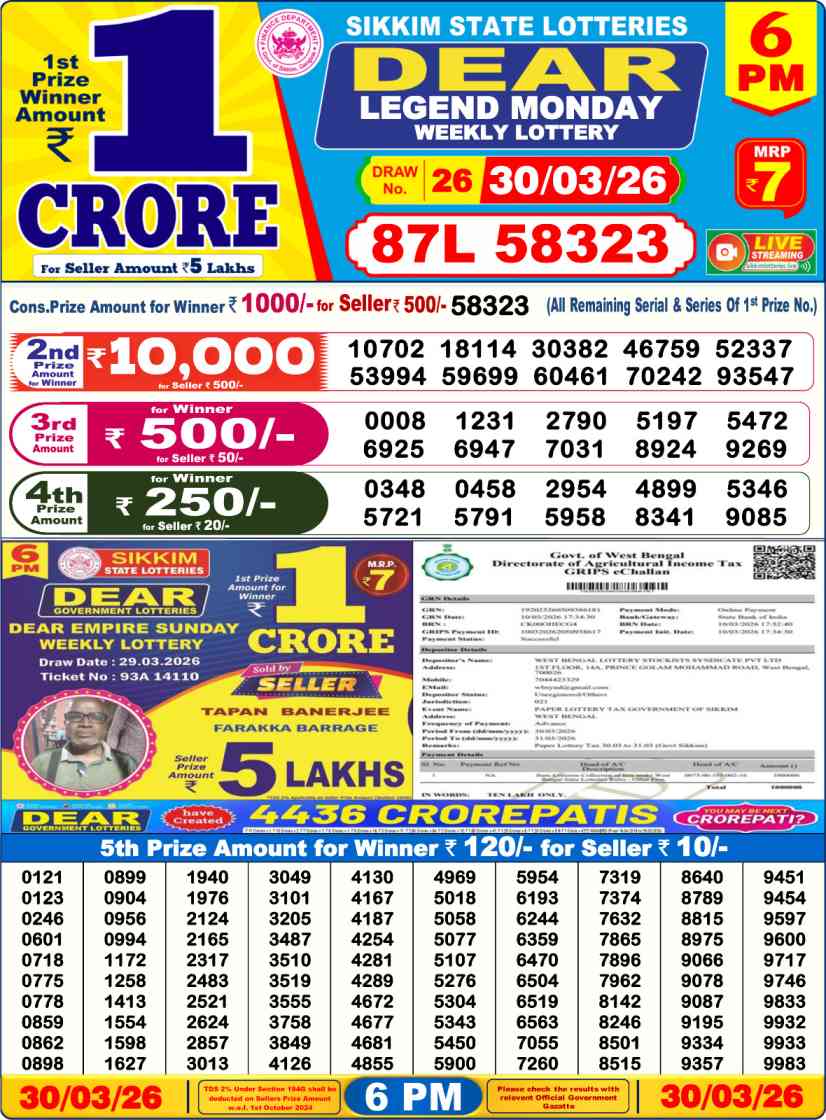 Are you ready to see the Sikkim State Lottery Result then the Sikkim State Lottery Result 31.3.2026 organized by the Sikkim State Government is declared at 1pm, 6pm, 8pm.Here Sikkim State Lottery live result, Dear Lottery Sambad live 31 March 2026, Dear Lottery Sambad Morning 31 3 26, Dear Sikkim State Lottery Sambad 31.3.2026, Lottery Sambad Night 31 March 2026 Draw takes place. Which you can see today’s first winner lottery number in the form of a jpg image.