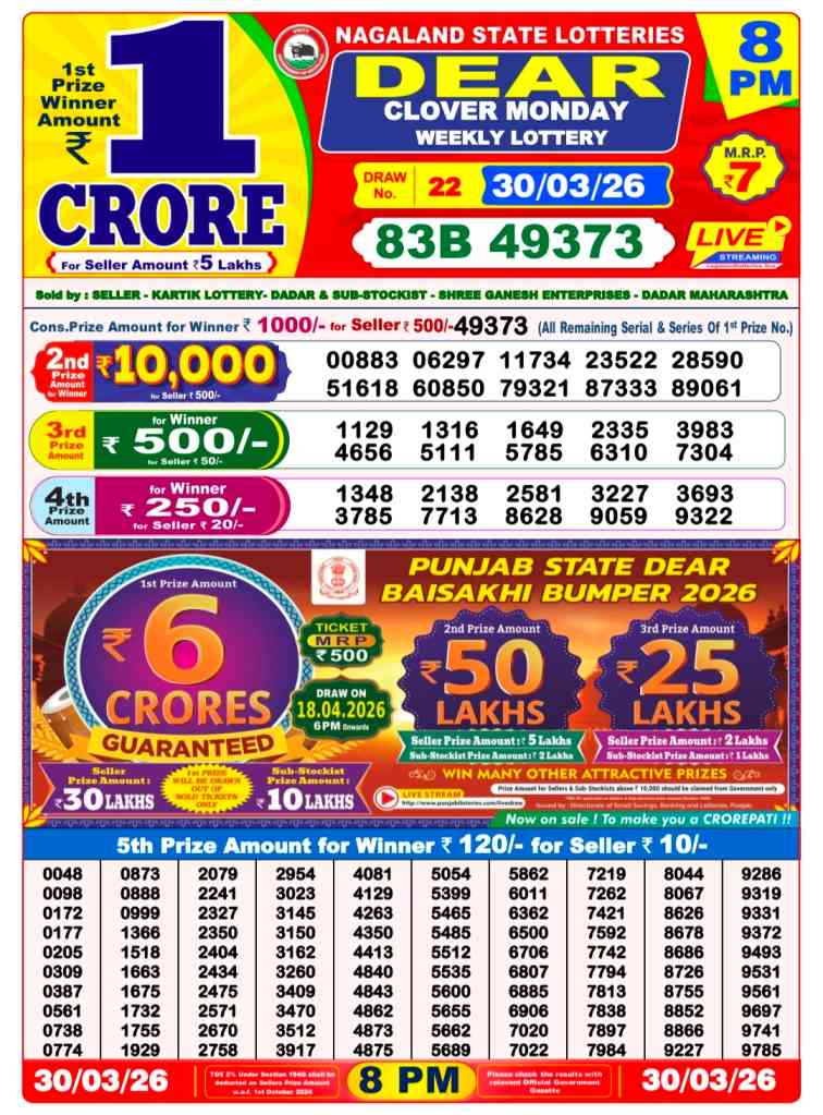 Nagaland lottery ticket is only 7 rupees but 1 crore is given as prize for winning the major. Results are also placed on this page which you can see. Nagaland lottery sambad is searched by different names, lottery sambad 8pm result, lottery sambad night result, night result 8pm, nagaland state lottery 8pm result, nagaland state lottery sambad 8pm Result, Nagaland State Lotteries, Nagaland State Lottery Result 8pm, 6pm, 1pm, Nagaland State Lottery Live, Nagaland Lotteries, Nagaland State Lottery Evening Result, Nagaland State Lottery Old Result, Lottery Sambad Old, Nagaland Lottery Sambad Night Result Live 8PM, Nagaland Lottery Sambad Result Live 6PM, Nagaland State Lottery Sambad Morning Result Live 1PM.