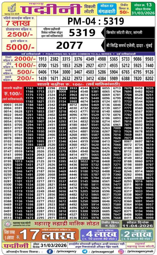 Maharashtra State Lottery declares many bumper results. Maharashtra Padmini 2026 Result is Maharashtra State Lottery at 04:15 PM whose result gets published on the page around 05:00 PM. Maharashtra State Padmini Weekly Lottery Result 31.3.2026 Live Draw Winner List at 4.15 PM, Maharashtra Dear Padmini Lottery 2026, Today Maharashtra Padmini Lottery, Maharashtra State Lottery Padmini Lottery Result Today Live, Maharashtra Padmini Draw 2026, Maharashtra Lottery Padmini Result 2026, Maharashtra Lottery 2026, Maharashtra State Lottery Result 2026, Maharashtra Padmini Lottery 31.3.2026 Result.