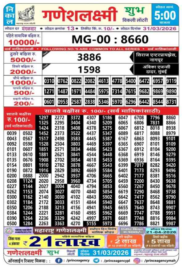 Maharashtra State Ganeshlaxmi Vijayi Weekly Lottery ticket is only Maharashtra Weekly rupees 10 for 1 ticket, but 10 thousand is given as prize for winning the major. Results are also placed on this page which you can see Ganeshlaxmi Vijayi Weekly Lottery Result today 31.3.2026 is searched by different names, Maharashtra State Ganeshlaxmi Vijayi Weekly Lottery Result 05:00pm, Maharashtra State lottery 05:00pm result , Maharashtra State Lottery today Ganeshlaxmi Vijayi Weekly lottery result, Maharashtra Ganeshlaxmi Vijayi Lottery Result, Maharashtra State Ganeshlaxmi Vijayi Weekly lottery result 2026, Ganeshlaxmi Vijayi Weekly lottery result 05:00pm, Maharashtra State lottery 2026.