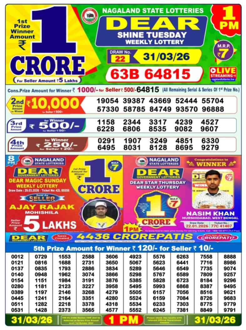 As per the official information provided by the Nagaland State Lotteries, 1.4.2026 Results the winner of today’s Dear First Winner award will receive INR 1 Crore from a ticket worth INR 6. You can check your result from the lotterysambad 1 4 26 link given below…