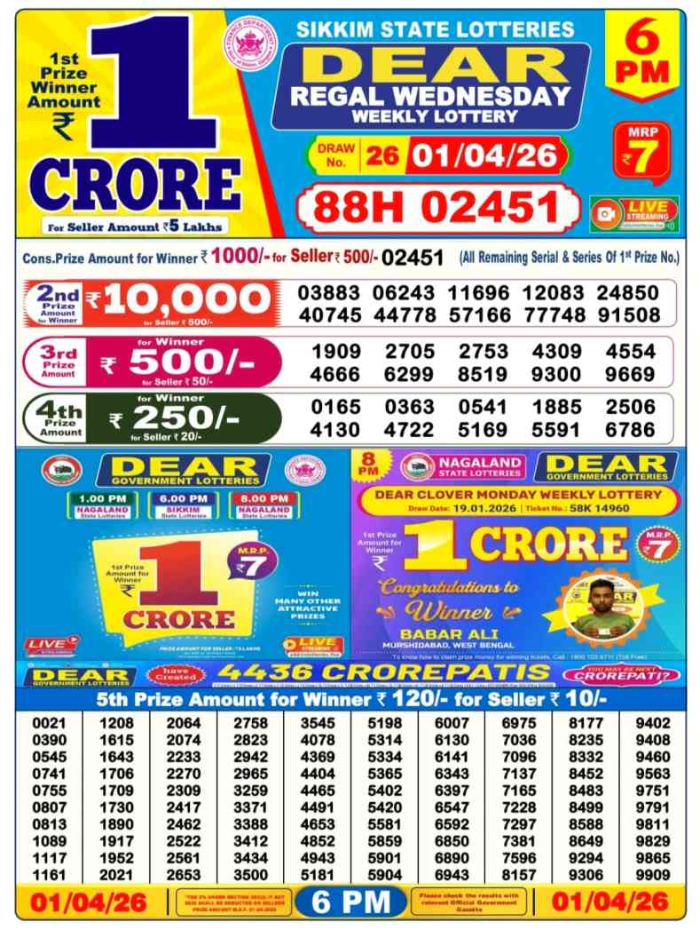 Sikkim State Lottery 2.4.2026 Today Result is weekly lottery draw whose lottery result is published thrice a day. Mainly Nagaland State Lottery is 8pm, 1pm, 6pm Nagaland State Lottery but being combined with lottery sambad 2.4.2026, Sikkim State Lottery, Nagaland State Lottery will release the results of 1pm, 6pm, 8pm. is published.