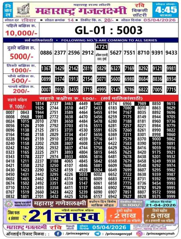 Maharashtra State Lottery 5.4.2026 Today Result is Maharashtra State Gajlaxmi Ravi Weekly Weekly lottery Result draw whose Maharashtra lottery result is published a day. Mainly Maharashtra State Lottery is 4:45 pm Maharashtra State Lottery but being combined with lottery sambad, Maharashtra State Lottery will release the results of 04:45pm is published.