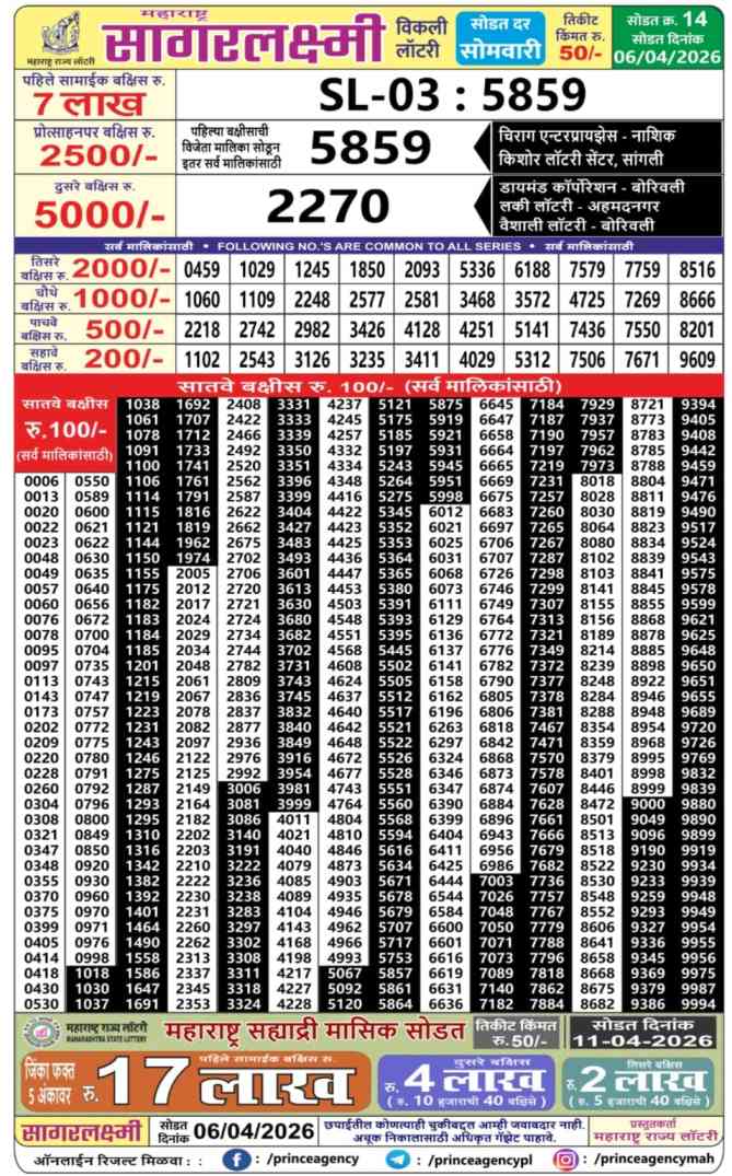 Maharashtra State Sagar Laxmi lottery ticket is only 50 rupees for 1 ticket, but 8 Lakh Rupees is given as prize for winning the major. Results are also placed on this page which you can see Maharashtra Sagar Laxmir Result Today 6.4.2026 is searched by different names, Maharashtra State Sagar Laxmi Weekly 2026, Maharashtra Sagar Laxmi Weekly Lottery Result 2026, Maharashtra Sagar Laxmi Lottery Result 6.4.2026 Live Result 4:15 PM, Maharashtra Sagar Laxmi Lottery Result 6.4.2026, Dear Maharashtra Sagar Laxmi PDF Result, Today Live Maharashtra Sagar Laxmi Weekly Lottery Result, Maharashtra State Sagar Laxmi Weekly 2026 Draw, Maharashtra State Sagar Laxmi Weekly 2026 Result.
