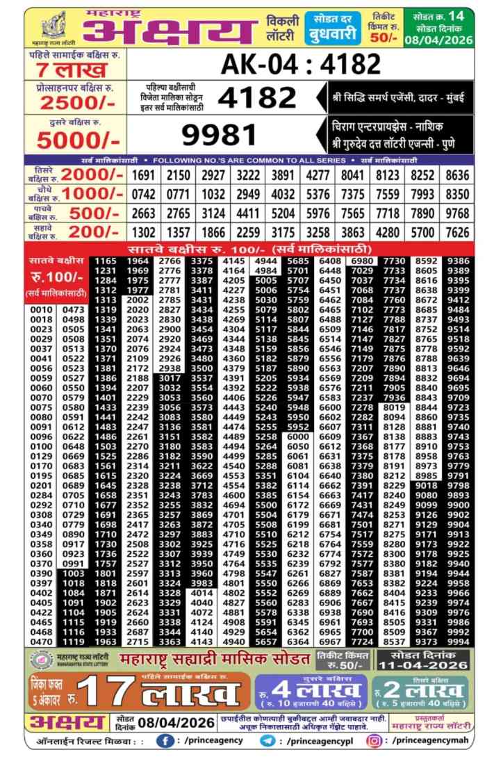 Maharashtra State Akshay lottery ticket is only 50 rupees for 1 ticket, but 8,00,000 Rupees is given as prize for winning the major. Results are also placed on this page which you can see Maharashtra Akshayr Result Today 8.4.2026 is searched by different names, Maharashtra State Akshay Weekly 2026, Maharashtra Akshay Weekly Lottery Result 2026, Maharashtra Akshay Lottery Result 8.4.2026 Live Result 4:15 PM, Maharashtra Akshay Lottery Result 8.4.2026, Dear Maharashtra Akshay PDF Result, Today Live Maharashtra Akshay Weekly Lottery Result, Maharashtra State Akshay Weekly 2026 Draw, Maharashtra State Akshay Weekly 2026 Result.