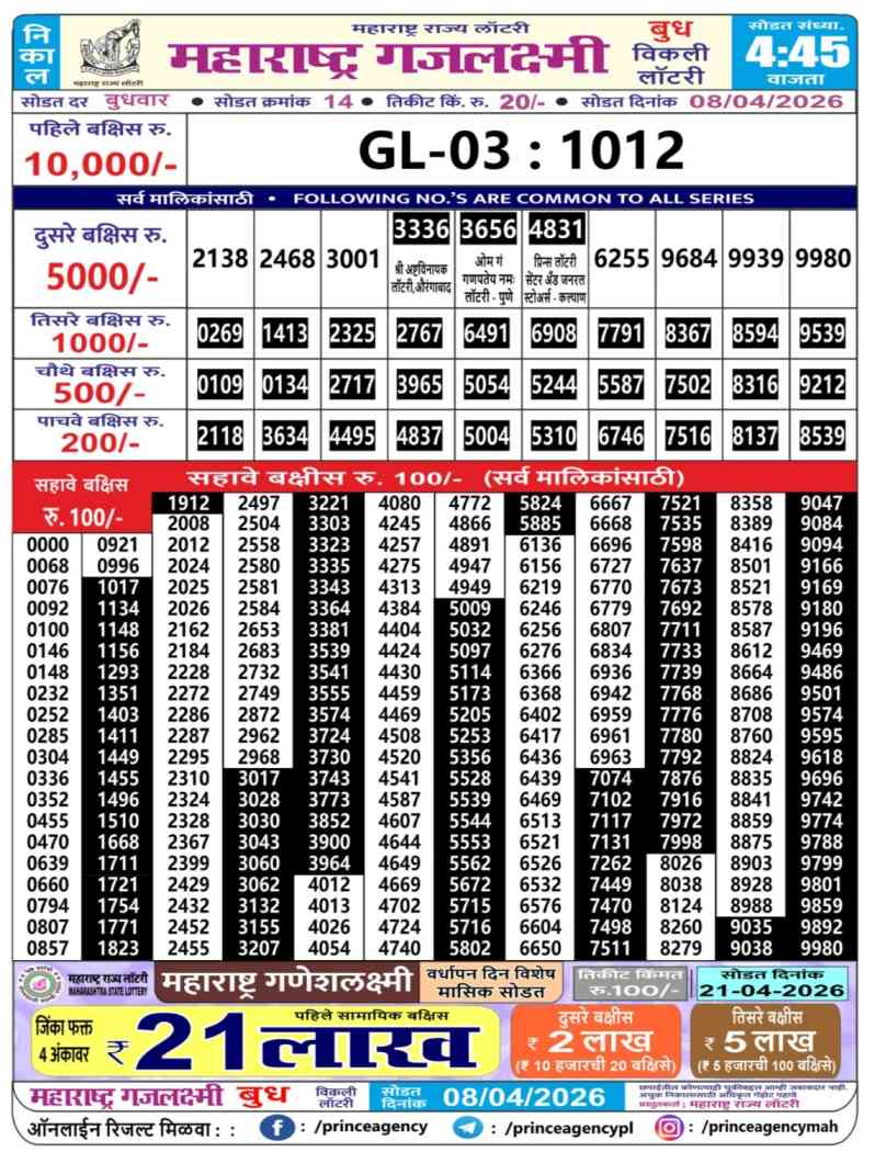 Maharashtra State Lottery declares many bumper results. Gajlaxmi Budh Weekly Lottery Result 2026 is Maharashtra State Lottery at 04:45 PM whose result gets published on the page around 05:30 PM. Maharashtra State Lottery Result , Gajlaxmi Budh Weekly Result, Gajlaxmi Budh Result Today Live 4:45PM, Maharashtra Gajlaxmi Budh Weekly Result 4:45PM, Maharashtra State Gajlaxmi Budh Weekly Result, Maharashtra State lottery result 4:45PM, Gajlaxmi Budh Weekly Result, Gajlaxmi Budh Weekly result, Maharashtra lottery result today 4:45PM, Gajlaxmi Budh Lottery 4:45 PM result , Maharashtra Gajlaxmi Budh Weekly Lottery Result, Gajlaxmi Budh Live Draw.