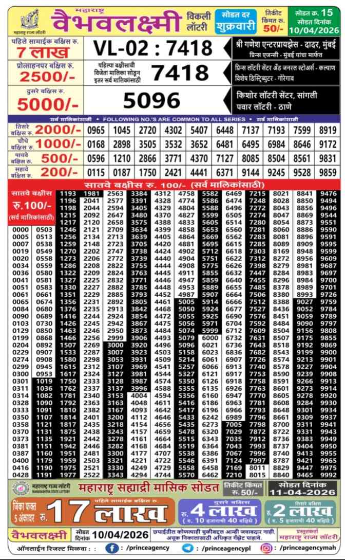 Download Maharashtra State Lottery 10.4.2026 Today 4:15pm Result from here. Maharashtra State Vaibhav Laxmi Weekly Lottery Result Important Lottery of Maharashtra State which is legally operated by the State Government there. You are satisfied to get the Result of Maharashtra Vaibhav Laxmi Lottery Draw at 04:15pm on this webpost Today’s lottery result of Maharashtra State Lottery 4:15pm is published here.