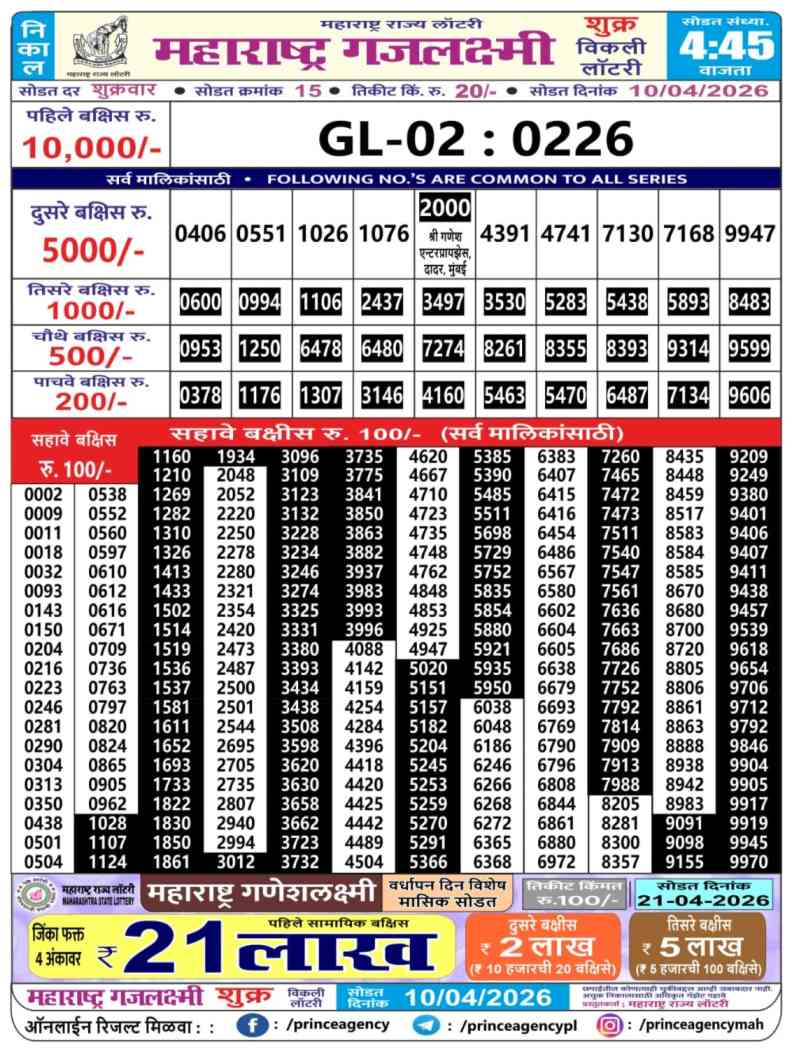 Maharashtra State Lottery 10.4.2026 Today Result is Maharashtra State Gajlaxmi Shukra Weekly Weekly lottery Result draw whose Maharashtra lottery result is published a day. Mainly Maharashtra State Lottery is 4:45 pm Maharashtra State Lottery but being combined with lottery sambad, Maharashtra State Lottery will release the results of 04:45pm is published.