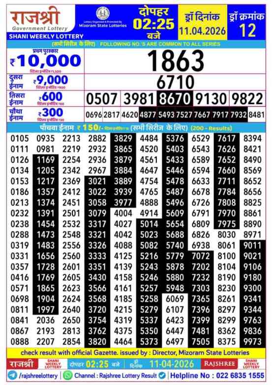 Download Mizoram Rajshree Lottery Shani 11.4.2026 Today 01:00PM Result from here. Mizoram Rajshree Weekly Lottery Result Important Lottery of Mizoram Rajshree which is legally operated by the Rajshree Government there. You are satisfied to Get The Result of Shani weekly Lottery at 01:00PM on this webpost Today’s Lottery Result of Mizoram Rajshree Lottery 01:00PM is published here.
