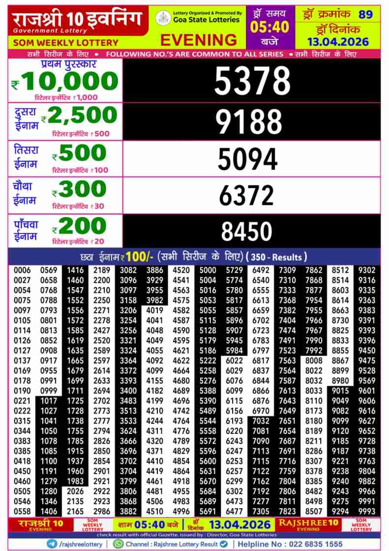 Goa Rajshree 10 Evening Som Weekly Lottery 5:40 PM Result 13.4.2026
