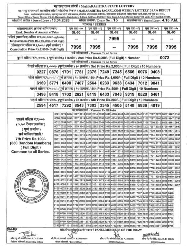 | Maharashtra State 13.4.2026 Sagar Laxmi Weekly Lottery Result 04:15 PM | Maharashtra State Sagar Laxmi Weekly Draw | Maharashtra State Sagar Laxmi Weekly Lottery Draw Result | Maharashtra Sagar Laxmi Lottery Result 04:15PM | Maharashtra State Lottery| Check Maharashtra State Lottery | |