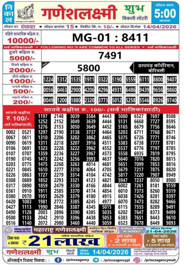 • Maharashtra State Ganeshlaxmi Vijayi Lottery 05:00 PM Result 14.4.2026
