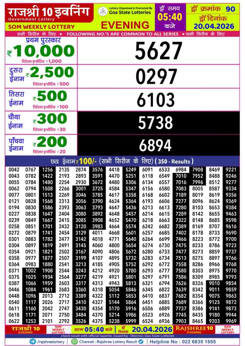 Goa Rajshree 10 Evening Som Weekly Lottery 5:40 PM Result 20.4.2026