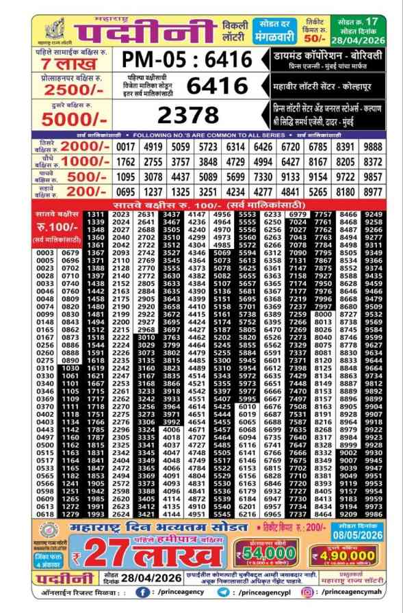 Maharashtra State Lottery declares many bumper results. Maharashtra Padmini 2026 Result is Maharashtra State Lottery at 04:15 PM whose result gets published on the page around 05:00 PM. Maharashtra State Padmini Weekly Lottery Result 28.4.2026 Live Draw Winner List at 4.15 PM, Maharashtra Dear Padmini Lottery 2026, Today Maharashtra Padmini Lottery, Maharashtra State Lottery Padmini Lottery Result Today Live, Maharashtra Padmini Draw 2026, Maharashtra Lottery Padmini Result 2026, Maharashtra Lottery 2026, Maharashtra State Lottery Result 2026, Maharashtra Padmini Lottery 28.4.2026 Result.