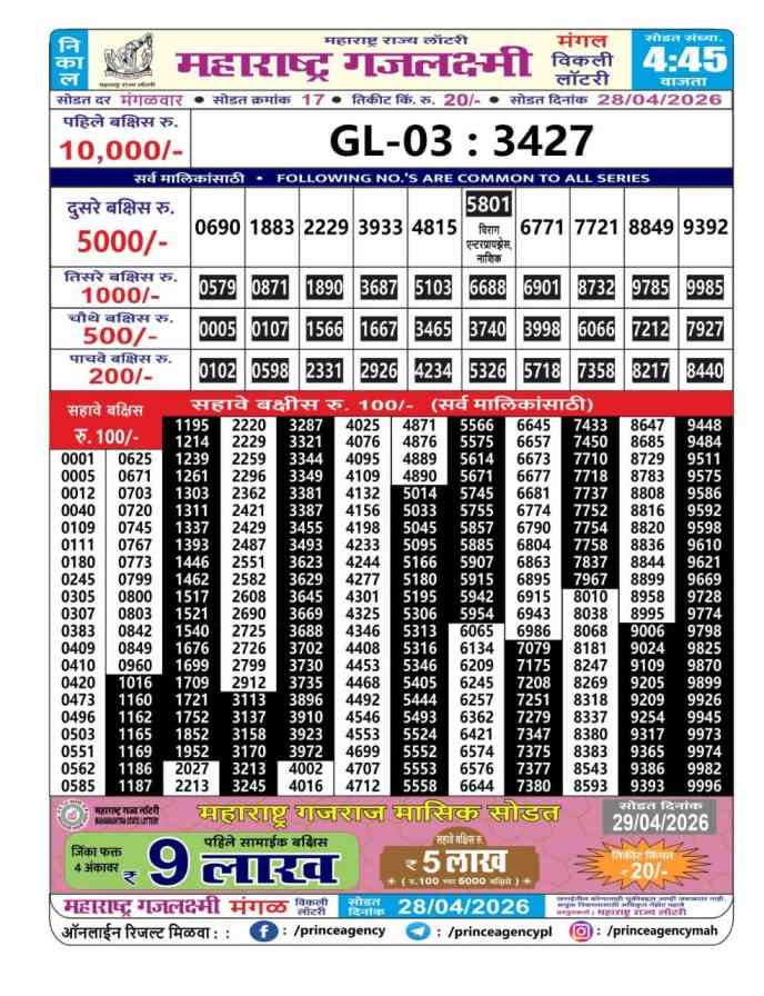 | Maharashtra Gajlaxmi Mangal Weekly Lottery Result Today Live 28.4.2026 | |
